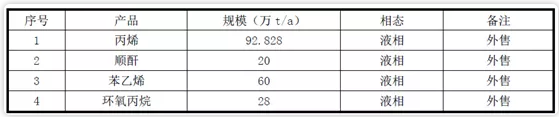 項(xiàng)目外售主要產(chǎn)品為聚合級(jí)丙烯、順酐、苯乙烯、環(huán)氧丙烷,外售副產(chǎn)品為碳四輕烴、輕芳烴、干氣、燃料油等。